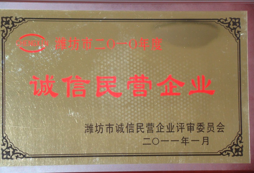 集團公司閥門公司及物流公司進過企業申報,被濰坊市誠信民營企業評審委員會評選為“濰坊市誠信民營企業”。